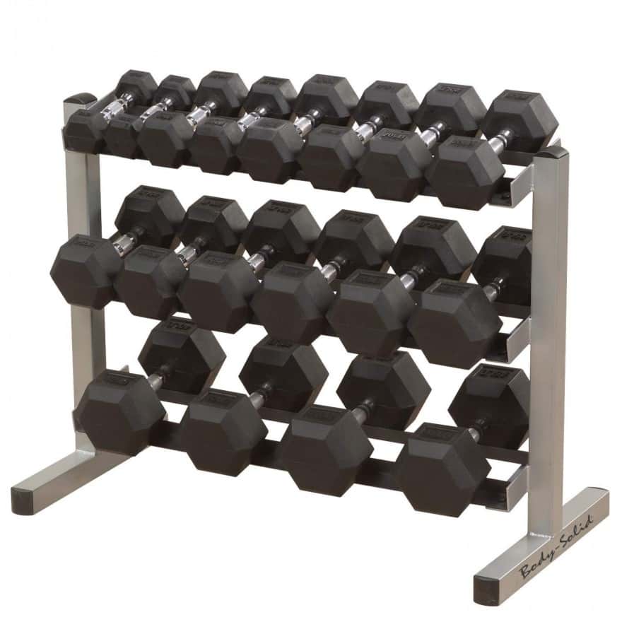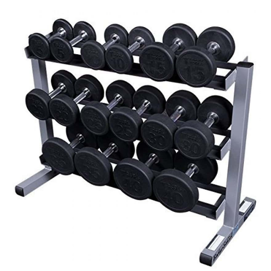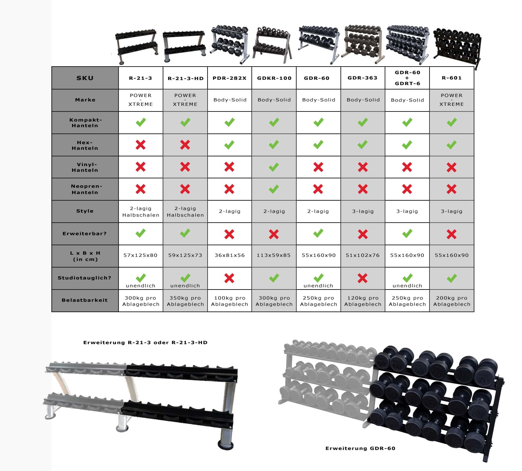 Die Body-Solid Kurzhantelablage eignet sich perfekt zur kompakten Aufbewahrung aller Kurzhantelarten, die ein Innenmaß bzw. eine Griffstücklänge von mehr als 11,5cm besitzen. Durch die angewinkelten Ablagebleche wird das Herausnehmen und Ablegen der Hanteln erleichtert und somit das Verletzungsrisiko deutlich gesenkt. Je nach Hantelgröße kann ein Ablageblech mit bis zu vier Hantelpaaren bestückt werden, so dass die Aufbewahrung von insgesamt 12 Kurzhantelpaaren möglich ist. Eine robuste 5 x 5cm Stahlrahmenkonstruktion sowie Ablageschienen aus vollmaterial gewährleisten eine sichere und vor allem extrem stabile Ordnungsmöglichkeit für Ihren Trainingsraum.