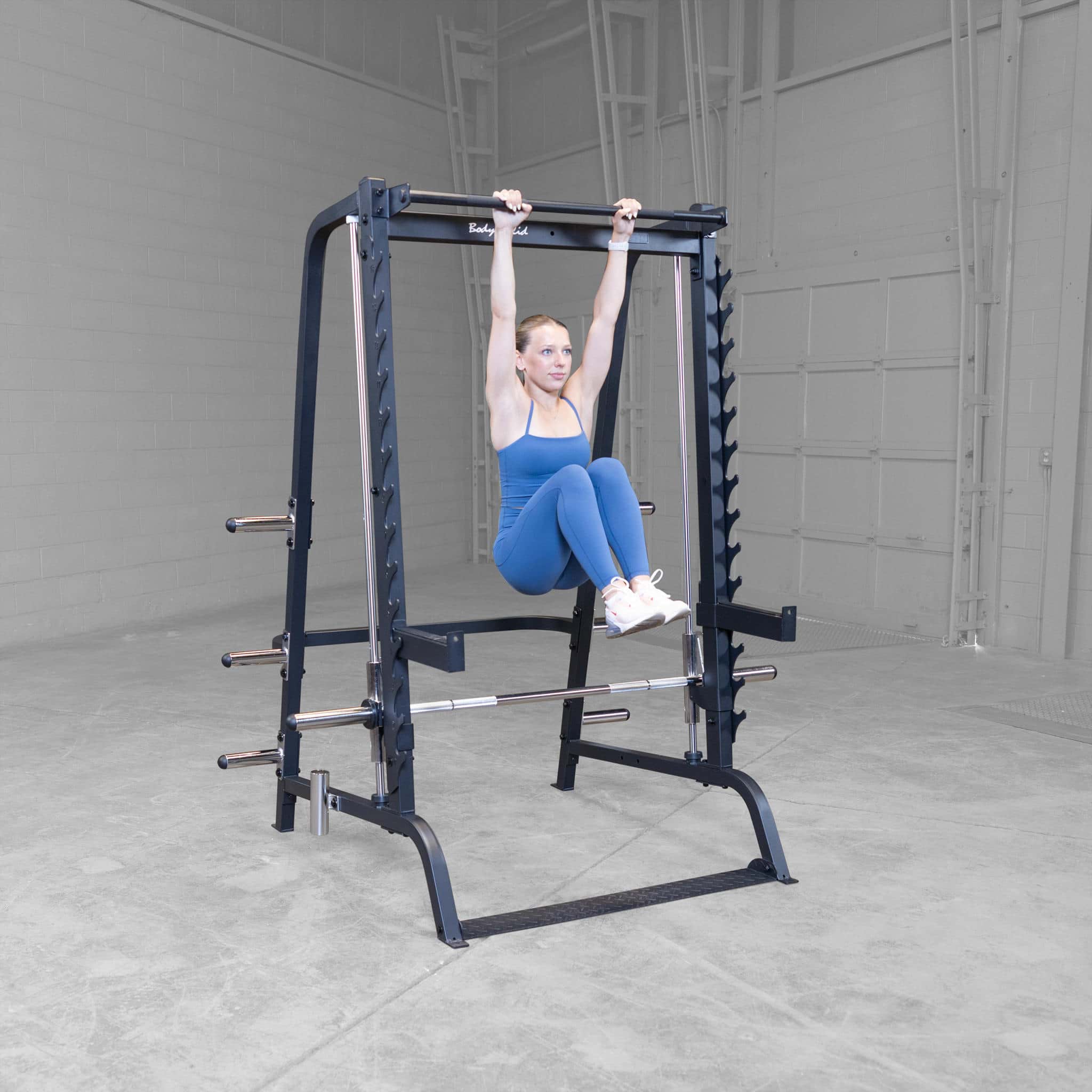 - vereint die Besten Eigenschaften einer Smith Machine, einem Half-Cage sowie einer Multistation