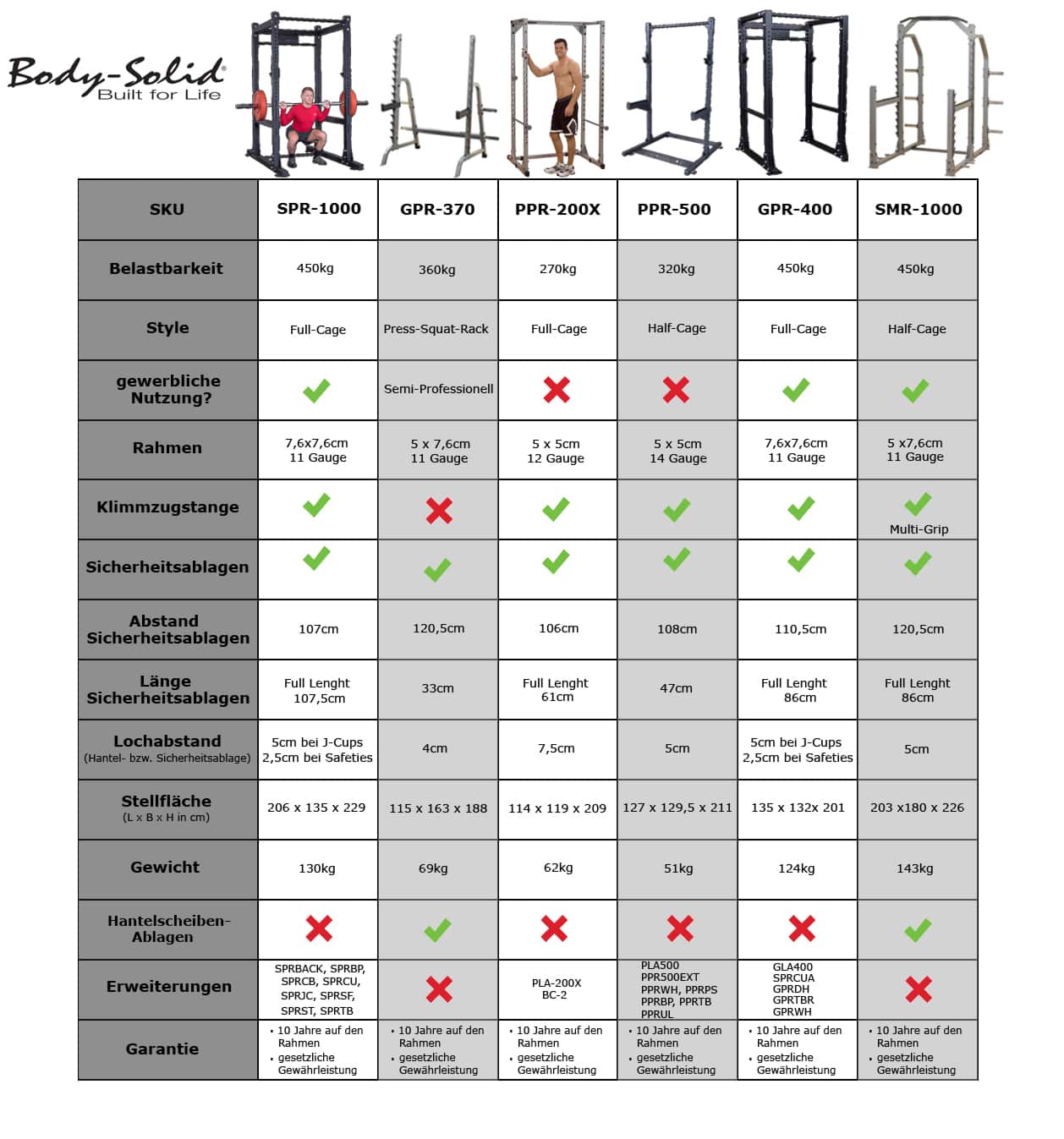 Das Body-Solid PPR-200X aus der Powerline-Serie kann nach Ihren Vorstellungen und individuellen Trainingszielen erweitert werden und ist somit das perfekte Einsteigermodell für Ihr Heimstudio. Mit der Basisvariante können Sie Kniebeugen, Klimmzüge, Armcurls, Seitheben und Kreuzheben auf einfache und sichere Weise durchführen. Dabei bietet Ihnen das "walk-in"-Design maximale Bewegungsfreiheit bei jeder Übungseinheit. Die Klimmzugstange, die Sicherheitsablagen sowie ein Paar von den kurzen Hantelablagen sind bereits im Lieferumfang der Basisvariante enthalten und lassen ein Training mit Gewichten bis zu 200kg zu. 18 Einstellpositionen der Hantel- und Sicherheitsablagen sorgen dabei für maximale Sicherheit. Die Hantelablage besitzt eine Breite von 115cm, weshalb eine Langhantelstange mit einem Innenmaß von mindestens 120cm verwendet werden sollte. In Kombination mit einer Hantelbank können Sie das Übungsspektrum noch weiter erhöhen, sodass u.a. Flach- und Schrägbank sowie Nacken- und Schulterdrücken durchgeführt werden können. Das PPR-200X kann mit einem Latzug- und Ruder-Anbau, einer zusätzlichen Hantelablagen sowie einer Dip-Station erweitert werden.