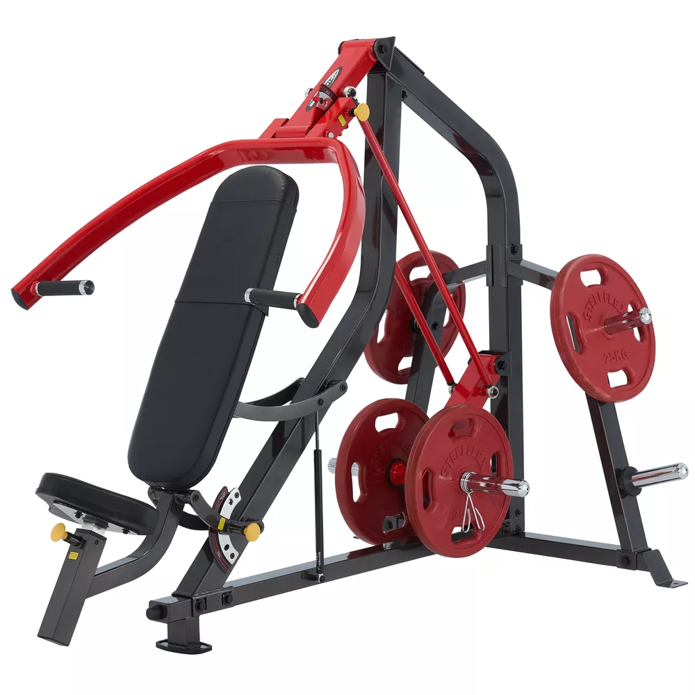 Die Steelflex Brust- und Schulterpresse ergänzt den Plate-Load-Zirkel mit einer extrem stabilen und effizienten Maschine. Die verstellbare Rückenlehne sowie der einstellbare Drückerarm bieten mehrere Presswinkel, um die Entwicklung des Trapezius, des Brustmuskels, des Deltamuskels und des Trizeps zu steigern. Dank des hydraulisch verstellbaren Sitzpolsters kann die perfekte Trainingsposition schnell und einfach eingestellt werden. Die intelligente Verbindungskonstruktion sorgt dabei für eine fließende Bewegung bei jeder Übungseinheit.